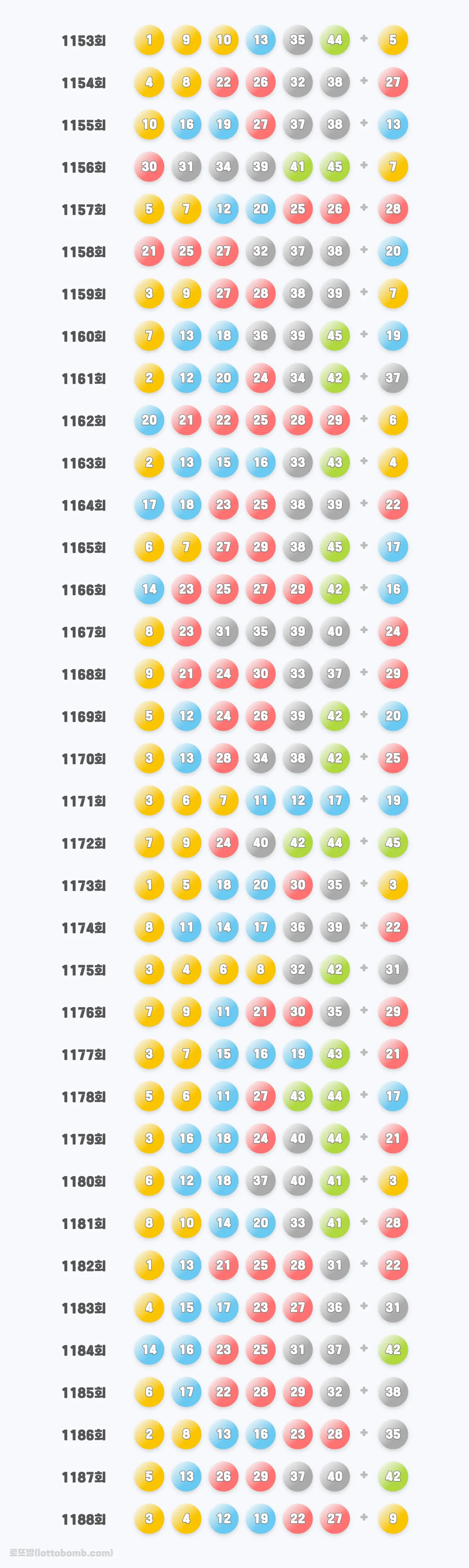 2025년 진행된 로또 회차는 1153회부터 1188회로 36개의 회차가 추첨되었습니다. 월별로 등장한 로또 번호를 확인해 보겠습니다.