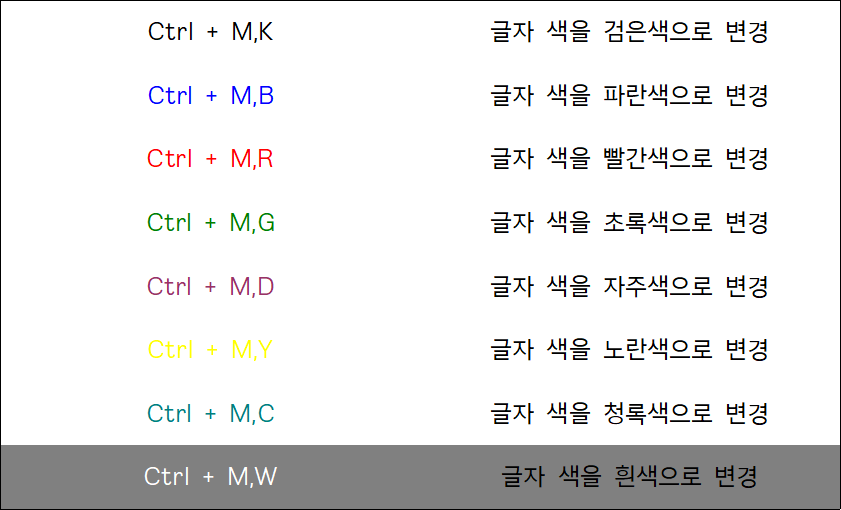 한글에서 글자 색을 변경할 수 있는 단축키를 정리한 표입니다. 위에서 설명한대로 8가지 색상을 변경할 수 있습니다. 단축키 Ctrl + M, K는 글자 색을 검정색으로 변경, Ctrl + M, B는글자 색을 파란색으로 변경, Ctrl + M, R은 글자 색을 빨간색으로 변경, Ctrl + M, G는 글자 색을 초록색으로 변경, Ctrl + M, Y는 글자 색을 노란색으로 변경, Ctrl + M, W는 글자 색을 하얀색으로 변경, Ctrl + M, C는 글자 색을 청록색으로 변경, Ctrl + M, D는 글자 색을 자주색으로 변경합니다. Ctrl + M 뒤에는 각 색상의 영어 이니셜이 들어가는데 검은색과 파란색은 이니셜이 B로 동일하므로 검은색만 예외로 가장 마지막 알파벳인 K를 사용합니다.